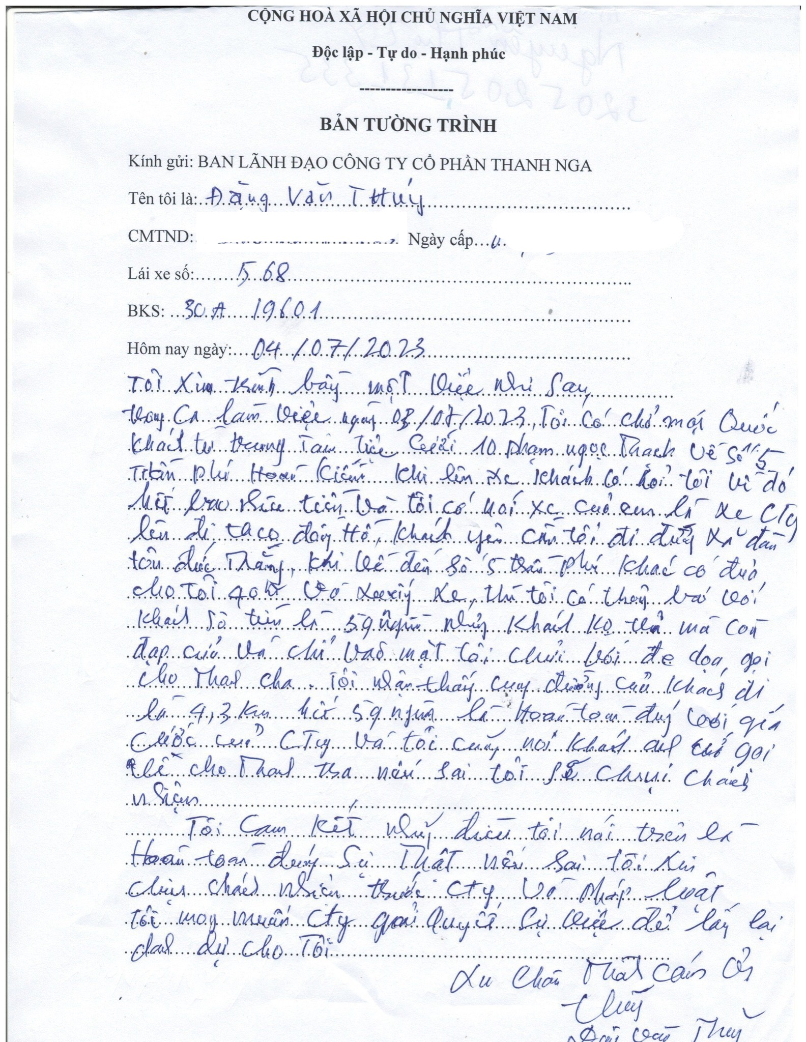 Vào khoảng 21h tối ngày 03/07/2023, khách hàng là chủ FB 𝐃𝐨𝐧𝐠 𝐓𝐫𝐚𝐧 có chụp ảnh chiếc xe của hãng taxi Thanh Nga BKS: 30A-196.01 đăng tải lên OFFB với những nội dung làm ảnh hưởng đến uy tín, hình ảnh của hãng: